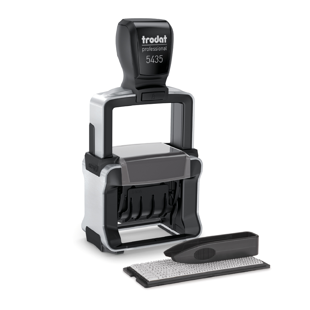 Der Trodat Professional 5435 ist ein Datumstempel mit Text zum Selbersetzen. Er hat eine Abdruckgröße von 41x24mm. Das Datum wird zentral in roter Farbe gedruckt, darüber und darunter liegen jeweils eine Textzeile in blauer Farbe mit einer Druckhöhe von 4mm.